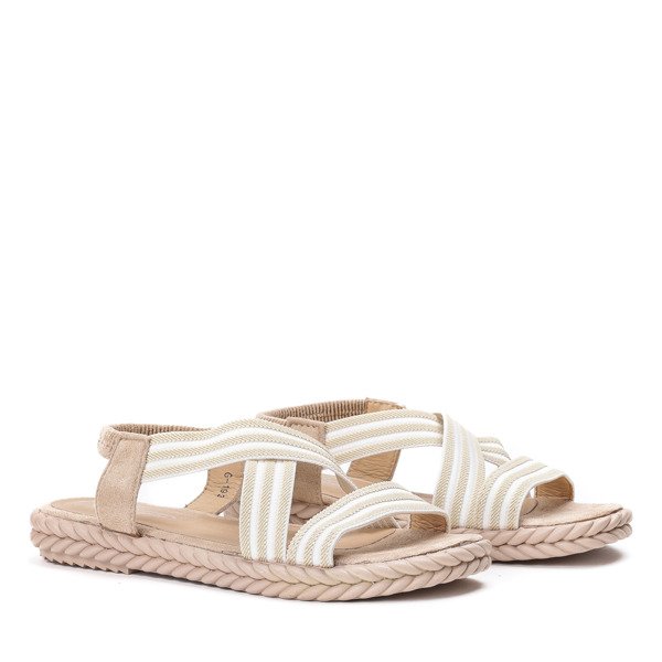 • Beige Sandalen auf einer niedrigen Gummisohle. Damenschuhe haben zwei Stretchgummis in der Schuhmitte. Die Innensohle besteht aus ökologischem Leder.