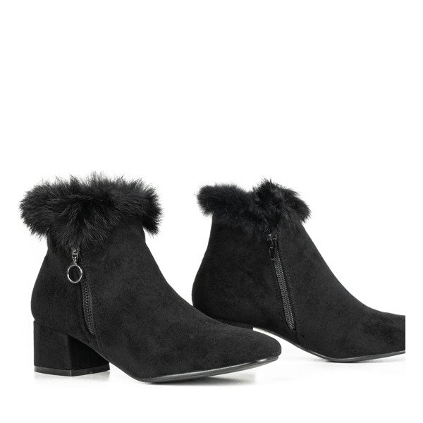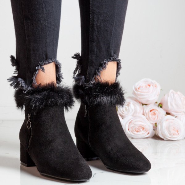 - Schwarze Stiefel auf einem niedrigen Pfosten mit quadratischem Zeh aus Öko-Wildleder. Das Obermaterial ist mit Fell und Reißverschluss verziert. Das Modell ist mit einem seitlichen Reißverschluss befestigt. In der Mitte der Isolierung in Form von Fell. St