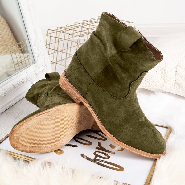 - Grüne Cowboystiefel aus ökologischem Wildleder. Das Modell ist innen mit einem weichen Fell isoliert. Schuhe auf einem niedrigen, bedeckten Keilabsatz. Schuhe mit Reißverschluss befestigt. Perfekt für kältere Tage.