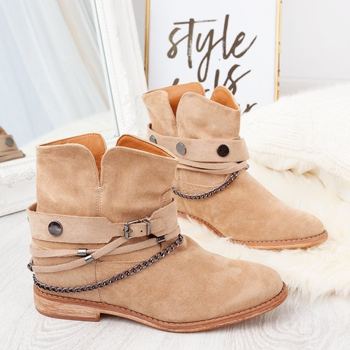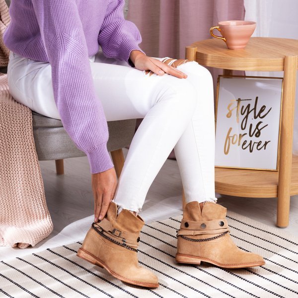 - Stiefeletten im Cowboy-Stil mit bedecktem Keilabsatz. Das Material ist Öko-Wildleder in beiger Farbe. Die Innenseite des Schuhs ist mit Fell isoliert. Schuhe haben Dekorationen, die entfernt werden können. Perfekt für den Alltag Garderobe!