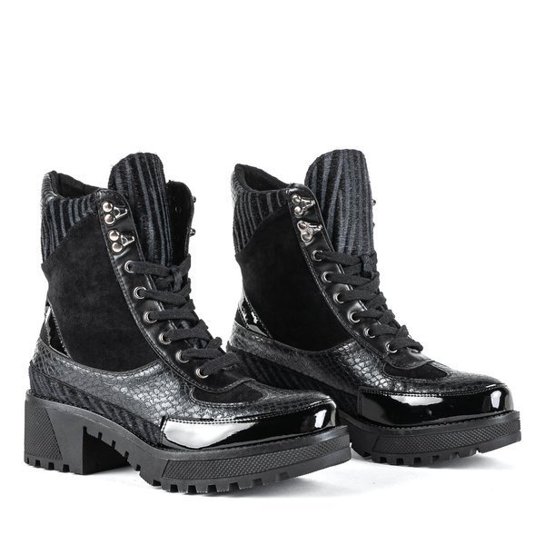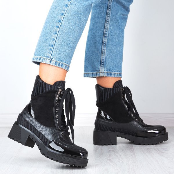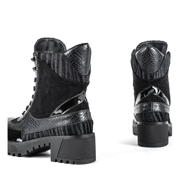 - Stilvolle Taschen auf einem stabilen Post. Das Obermaterial ist eine Kombination aus schwarzem Öko-Wildleder und Öko-Leder mit einem Tiermuster. Die Innenseite des Schuhs ist mit Fell isoliert. Die Stiefel haben Schnürung. Sie passen hervorragend zu Hosen