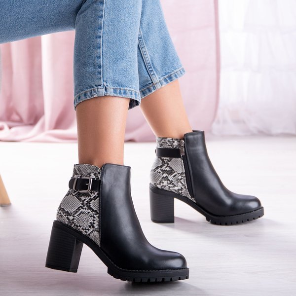 - Elegante Stiefeletten an einem hohen Pfosten. Das Material besteht aus Öko-Leder in Schwarz. Die Rückseite des Obermaterials imitiert die Schlangenhaut. Reißverschluss innen.