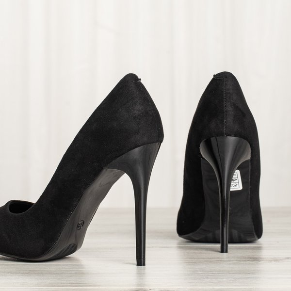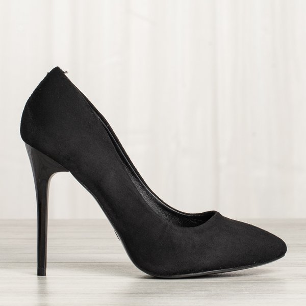 - Elegante Pumps auf einer Anstecknadel aus schwarzem Öko-Wildleder. Innensohle mit Kunstleder bezogen. Die präsentierten Damenschuhe sind eine großartige Ergänzung zu einer eleganten Stilisierung.