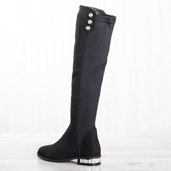 - Elegante Stiefel mit flachem Absatz und runder Spitze. Das Obermaterial besteht aus Öko-Wildleder und flexiblem Material. Der vordere Teil des Schuhs und der untere Teil sind mit Fell isoliert. Reißverschluss. Die Stiefel sind mit schönen Steinen verziert