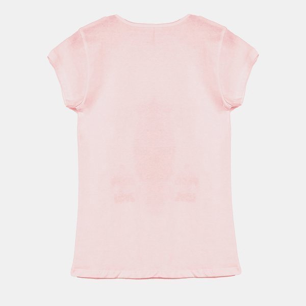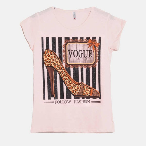 - Kurzarmhemd für Damen. Das Modell besteht aus rosa Stoff. Das Produkt hat einen dekorativen Aufdruck auf der Vorderseite. Funktioniert hervorragend mit Shorts. HINWEIS: Genauigkeitsmessung