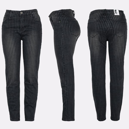 - Schwarze Damenhose mit hoher Taille. Material - schwarze Jeans mit weißen Streifen. Das Modell ist mit einem Reißverschluss und einem Knopf befestigt. Dekorative Träger lassen Ihre Beine länger aussehen. HINWEIS: Messgenauigkeit (+/-) 1 cm