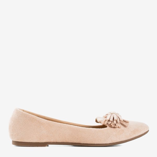 - Charmante Damenballerinas aus Wildleder. Rosa Schuhe. Die Innensohle besteht aus Kunstleder. In der Nase befindet sich ein goldenes Element und ein Bogen in Form von Quasten. Elegant ob