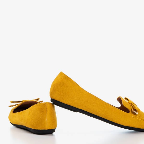 • Damen-Slipper in ihrer einfachsten Form. Das Obermaterial besteht aus Öko-Wildleder in Senffarbe. Der runde Zeh ist mit einer Schleife verziert. Sie passen hervorragend zu eleganten Hosen und Röcken!