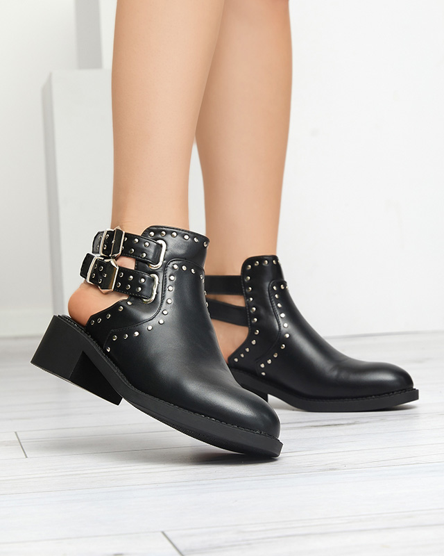 • Schwarze Damenstiefel mit Ausschnitten aus ökologischem Leder. Modell mit niedrigem Absatz, hinten mit Schnallen verschlossen. Der Schaft ist mit silbernen Strasssteinen verziert. Eine perfekte Ergänzung zu einer Lederjacke und einem Kleid!