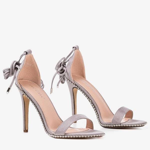 • Hellgraue Damensandalen auf einem hohen Absatz aus ökologischem Wildleder. Die Innensohle ist aus Öko-Leder. Modell mit Schnur in Knöchelhöhe gebunden. Schuhkanten mit silbernen Düsen verziert