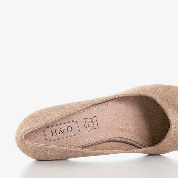 - Klassische beige Pumps am hohen Pfosten. Das Obermaterial besteht aus ökologischem Wildleder und die Innensohle ist mit Naturleder bezogen. Der elegante und schlichte Schnitt ist perfekt für den Alltag und den Abend.