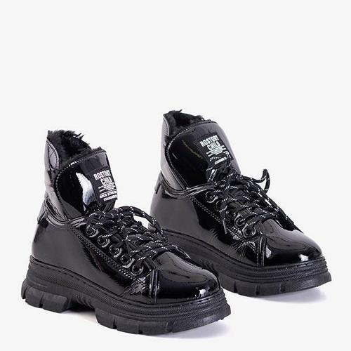 - Damen Wanderschuhe aus schwarz lackiertem ökologischem Leder. Schnürmodell mit Ausschnitten an den Seiten und warmem Fell im Inneren. Diese Schuhe sind eine großartige Ergänzung für Ihr Sportstyling.