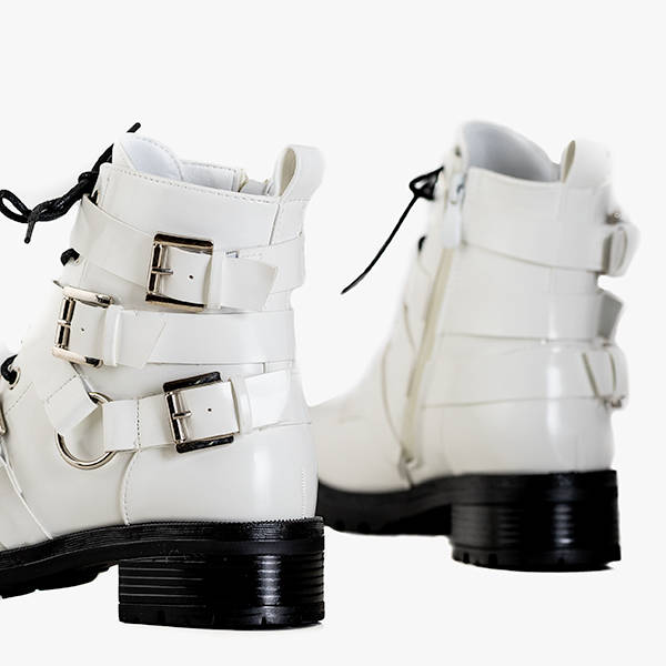 - Damenstiefel mit flachen Absätzen im Stil von Arbeitern. Das Obermaterial besteht aus ökologischem Leder in Weiß und ist mit Streifen mit Schnallen verziert. Schnürschuhe mit Reißverschlüssen. Das Modell ist mit einem zarten Fell isoliert.