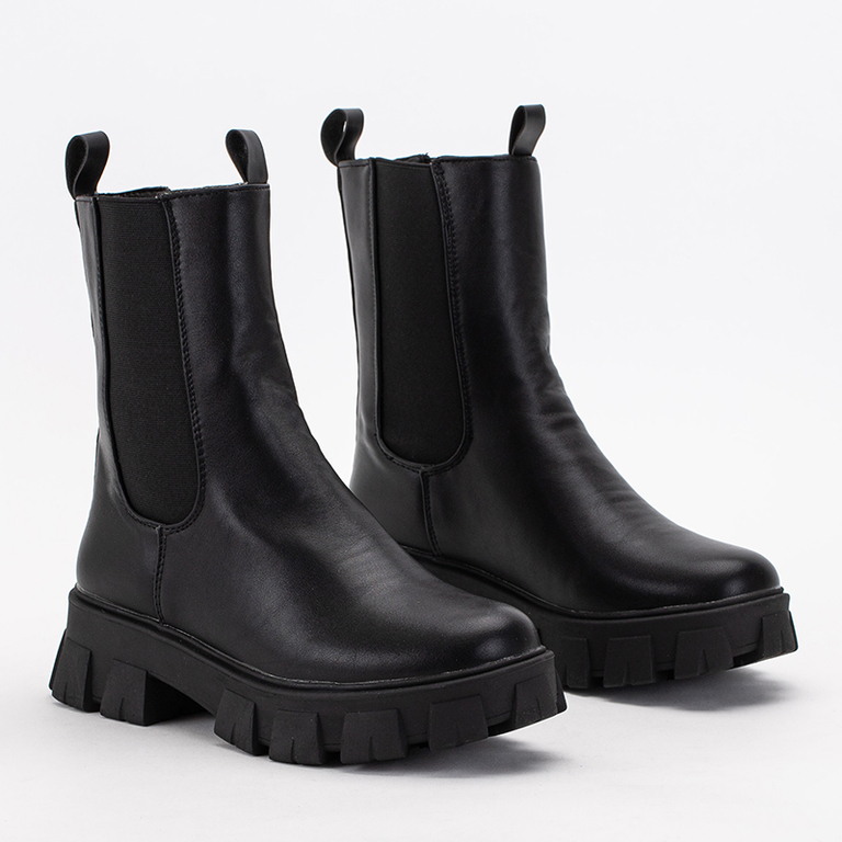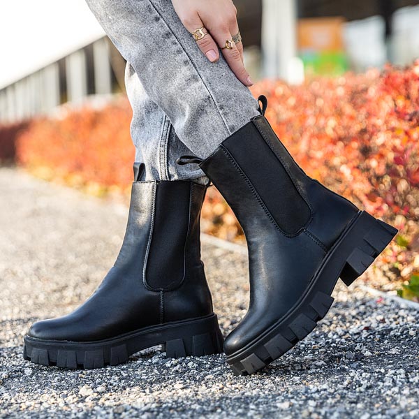 • Schwarze Arbeitsstiefel mit dicker Sohle. Das Modell besteht aus Öko-Leder, Innensohle aus Stoff. Die Schuhe haben elastische Einsätze an den Seiten des Obermaterials.