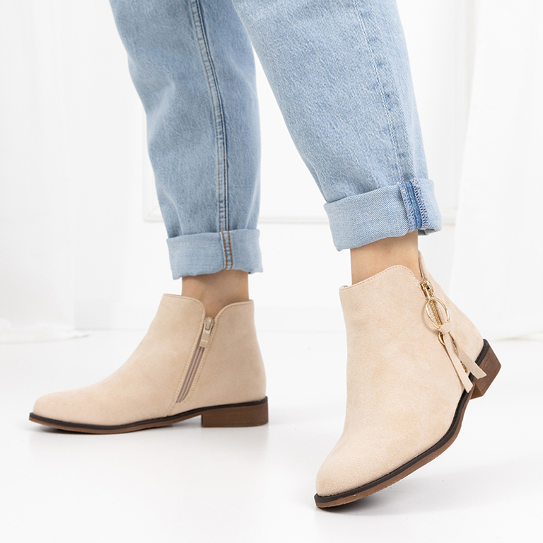 - Klassischer Damenstiefel mit flachem Absatz, aus ökologischem Wildleder. Sie haben Fell im Inneren. Mit einem Reißverschluss befestigt.