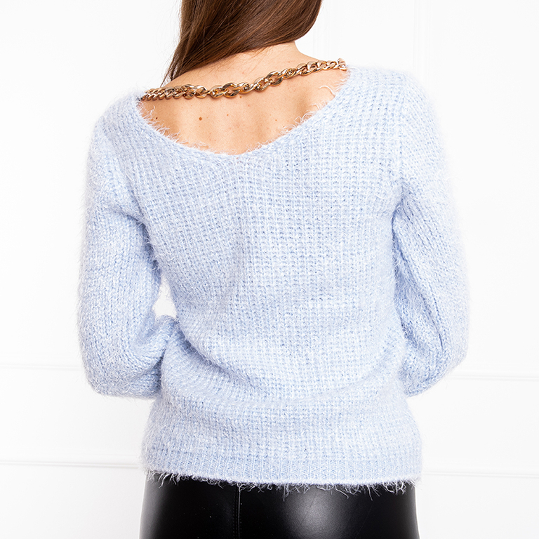 - Stylischer kurzer Damen Oversize Pullover aus Acrylmaterial. Pullover mit "V"-Ausschnitt, auf der Rückseite eine goldene Kette eingenäht. HINWEIS: Messgenauigkeit (+/-) 1 cm.