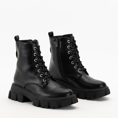 - Schwarze Arbeitsstiefel für Damen aus ökologischem Leder. Schnürmodell mit Reißverschluss. Die Innenseite des Schuhs ist mit Stoff gefüttert - keine Isolierung.