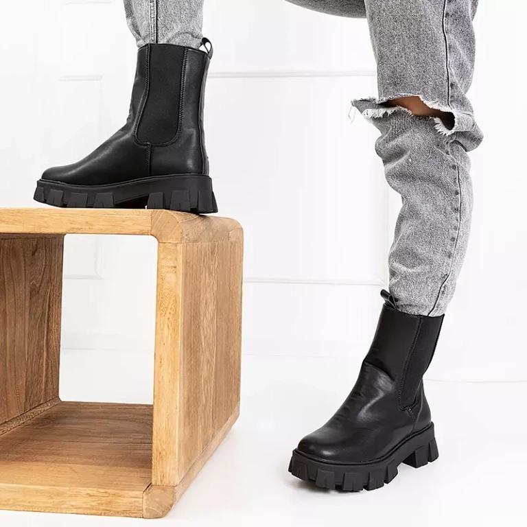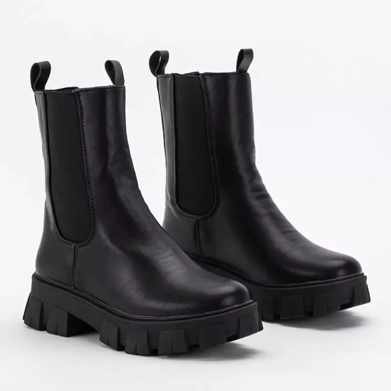 - Schwarze Arbeitsstiefel mit dicker Sohle. Das Modell besteht aus Öko-Leder, Innensohle aus Stoff. Die Schuhe sind fein isoliert, haben elastische Einsätze an den Seiten des Obermaterials.