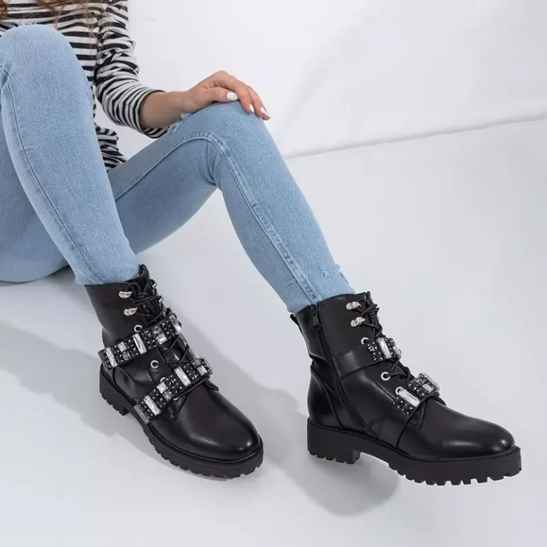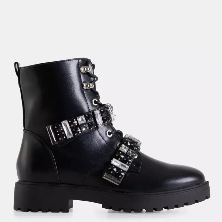 • Sensationelle Damen-Stiefeletten mit flachem Absatz aus ökologischem Leder. Das Modell ist mit Kristallen verziert, mit Reißverschluss und Klettverschluss geschlossen und mit Schnürsenkeln gebunden. Innen mit Fell isolierte Stiefel. Hinweis: Einige Dekora