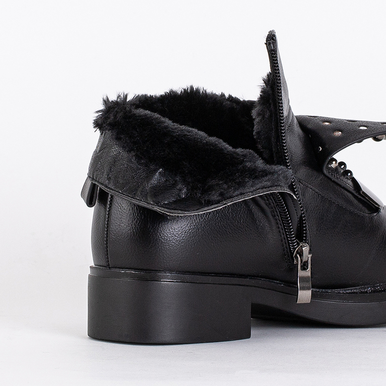 - Effektive Kinder-Stiefelette mit flachem Absatz aus Öko-Leder. Das Hauptelement des Modells ist die mit vielen schwarzen und silbernen Strasssteinen verzierte Zunge. Die Innenseite des Schuhs ist mit einem angenehm dicken Fell isoliert. Das Obermaterial i