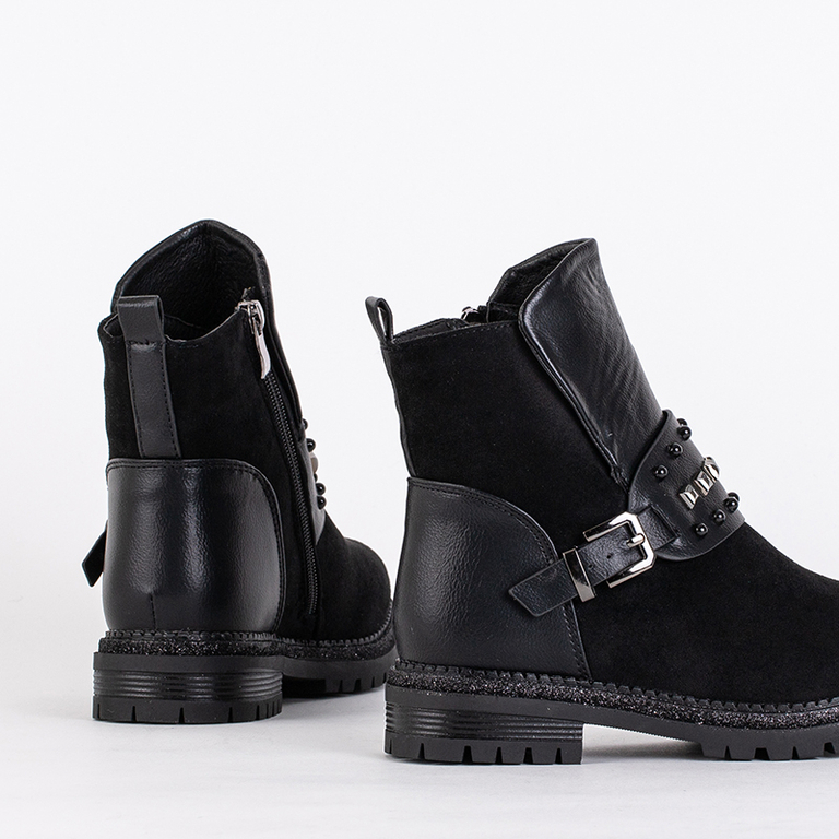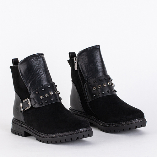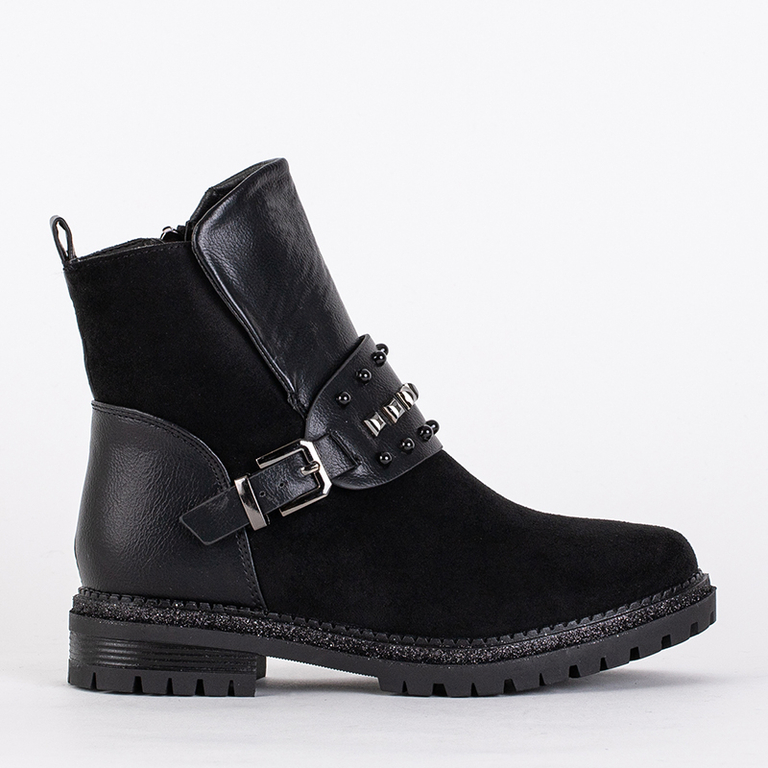- Flache isolierte Stiefel für Mädchen aus einer Kombination aus Öko-Leder und Öko-Wildleder. Sie haben innen dickes, synthetisches Fell. Streifen mit dekorativen Strasssteinen auf der Vorderseite. Perfekt für die Herbst- und Wintersaison!