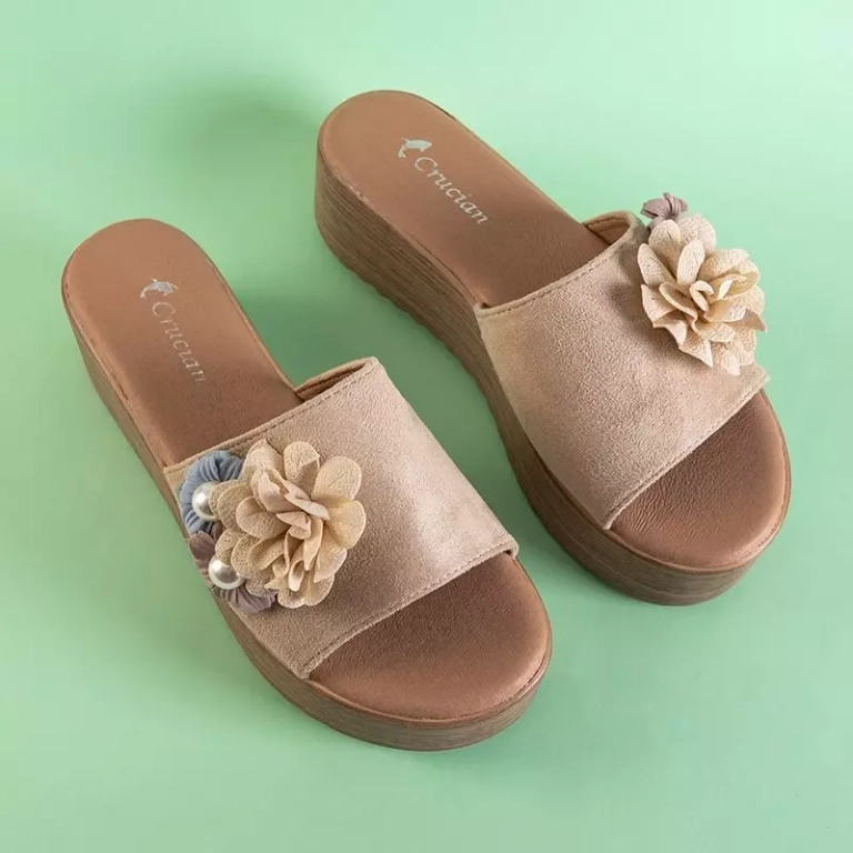 - Sensationelle Damenpantoffeln auf einem Plateau aus holzimitierendem Material. Paseczek ist Wildleder-Ökoleder, das mit Blumen verziert ist. Die Innensohle ist mit ökologischem Leder bezogen. Hinweis: Das Produkt weist Verfärbungen auf dem Material auf.