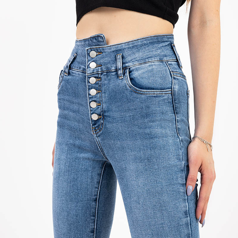 - Universelle Röhrenjeans aus Baumwollstoff. Hoch tailliertes Modell mit Knöpfen. Zwei Paar Taschen - hinten und vorne. Jeans passen zu vielen Outfits! HINWEIS: Messgenauigkeit (+/-) 1 cm.
