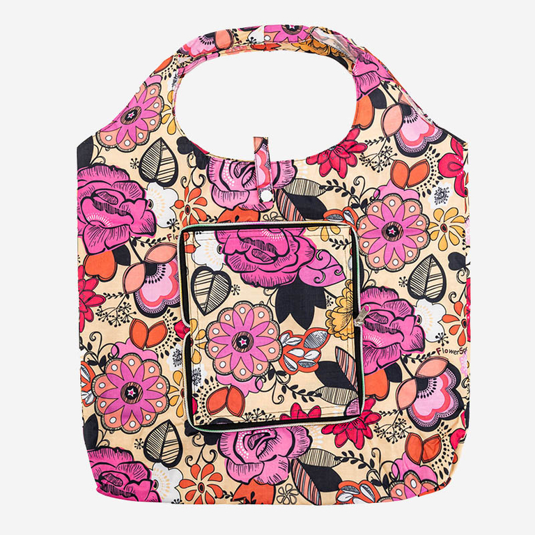 - Eine Einkaufstasche aus Stoff, die gefaltet und mit einem Reißverschluss geschlossen werden kann. Produkt mit einer zusätzlichen Tasche und einem Knopf.
