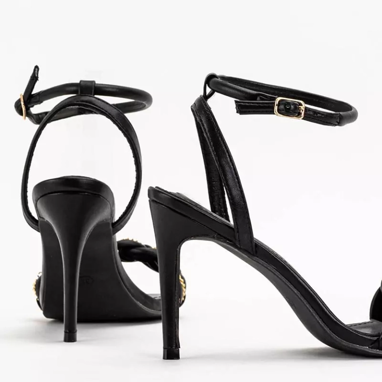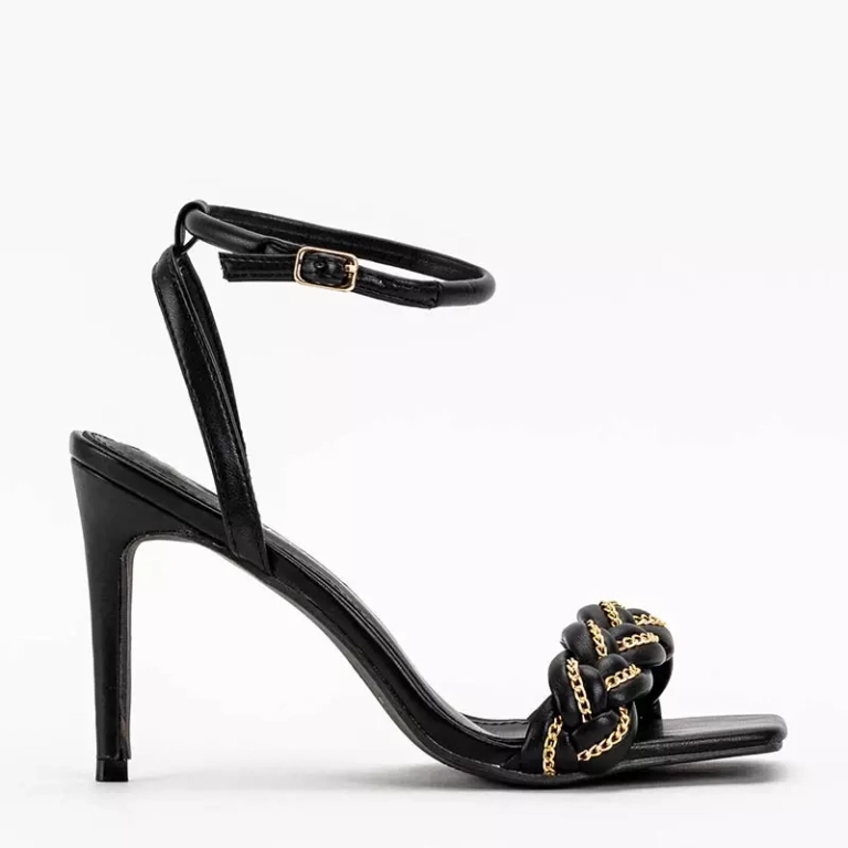 - Schöne Damensandalen auf hohem Absatz, verziert mit einer goldenen Kette. Das Paar besteht vollständig aus ökologischem Leder. Es gibt einen verstellbaren Riemen um den Knöchel, der mit einer Schnalle befestigt wird. Hinweis: Das Produkt hat Kratzer auf d