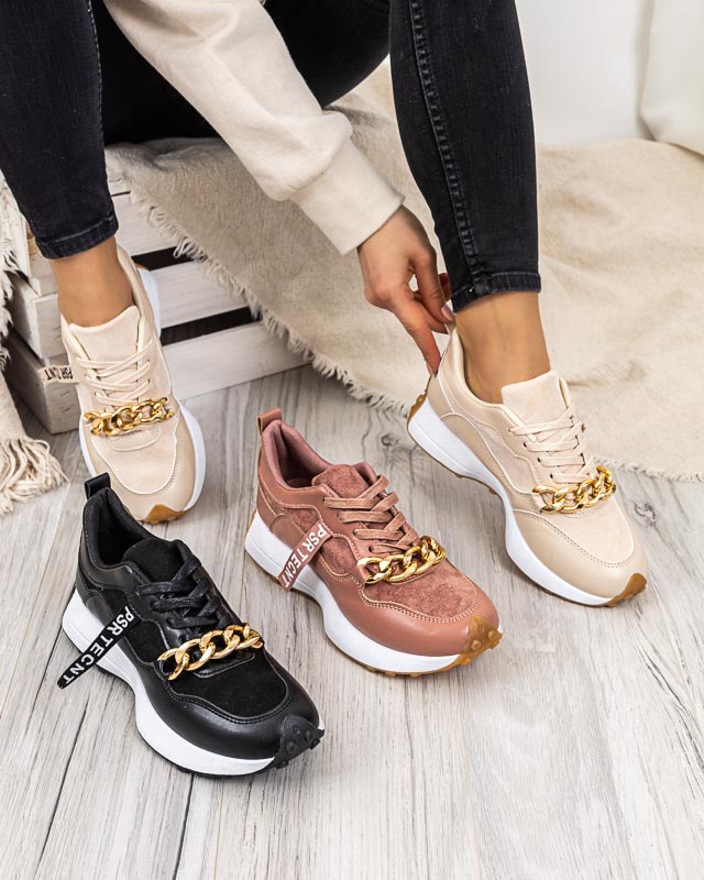 - Mega stylischer Damen Freizeitsportschuh, verziert mit einer Metallkette und Schriftzügen. Das Obermaterial besteht aus einer Kombination aus ökologischem Leder und ökologischem Fensterleder. Die Innenseite ist mit einem Stoffmaterial ausgekleidet. Die pe