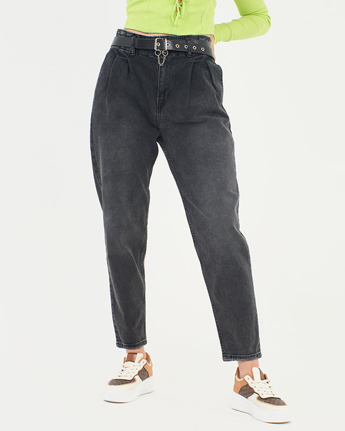- Stylische Mom-Jeans für Damen aus Baumwollmaterial. Das Modell hat: - hohe Taille, - Knopf- und Reißverschluss, - 4 Taschen, - Gürtel 100 cm lang und 3 cm breit HINWEIS: Messgenauigkeit (+/-) 1 cm.