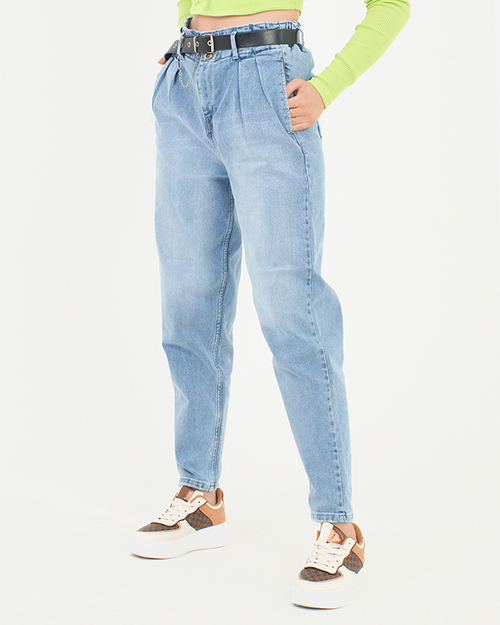 - Stylische Mom-Jeans für Damen aus Baumwollmaterial. Das Modell hat: - hohe Taille, - Knopf- und Reißverschluss, - 4 Taschen, - Gürtel 100 cm lang und 3 cm breit HINWEIS: Messgenauigkeit (+/-) 1 cm.