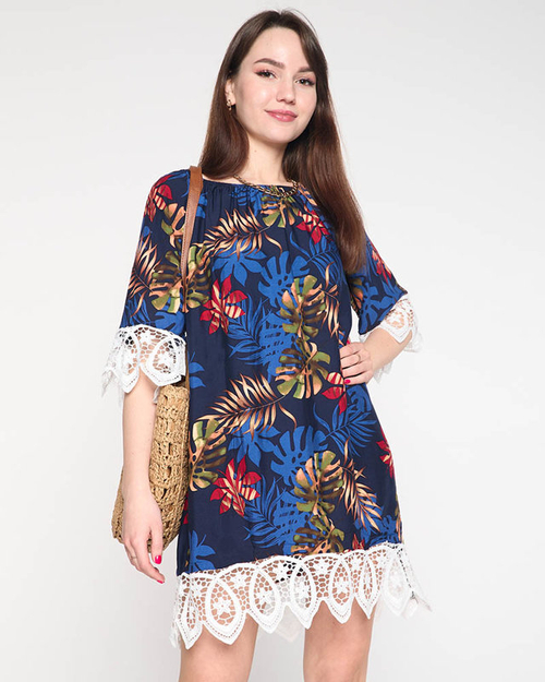 - Damentunika mit kurzen Ärmeln und aus leichtem Stoff. Das Modell ist mit einem Blattdruck verziert, die Ärmel und der untere Teil der Tunika sind mit Spitze verziert. Eine brillante Wahl für heiße Tage! HINWEIS: Messgenauigkeit (+/-) 1 cm.