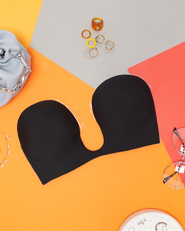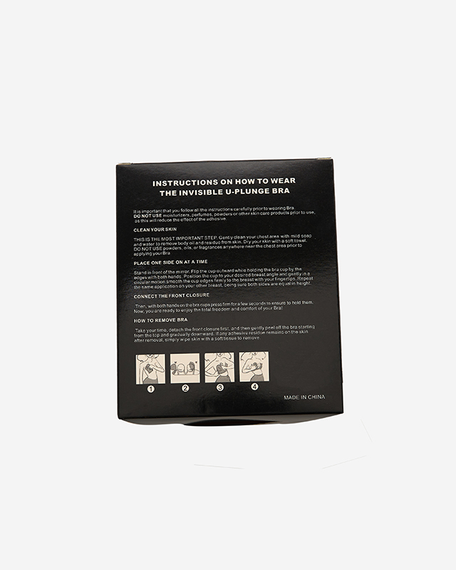 - Ein selbsttragender Damen-BH, fixiert mit dünnen Gel-Inneneinlagen an den Körbchen und Gelschichten auf farblosen Silikonflügeln an den Seiten. In den versteiften Körbchen befinden sich Bügel. HINWEIS: Messgenauigkeit (+/-) 1 cm.