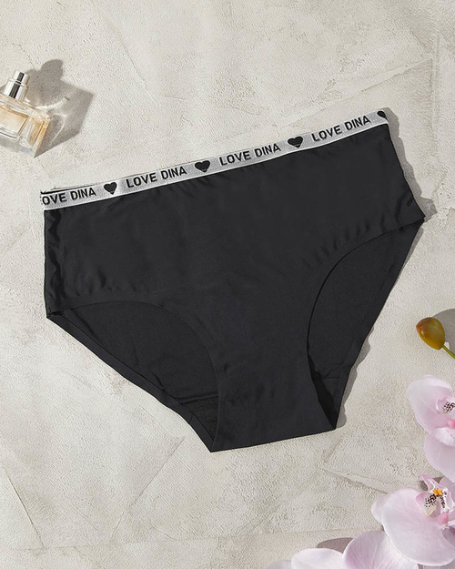 Schwarzer Damenslip mit Zierstreifen mit Aufschrift - Unterwäsche