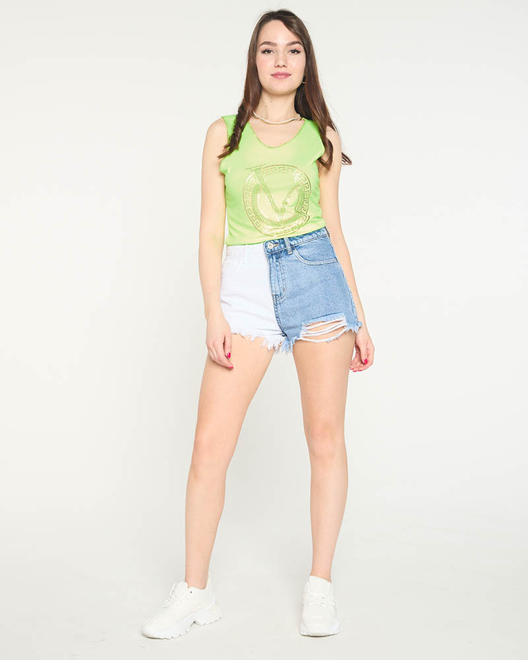 - Ein feminines Top mit Trägern aus elastischem Material. Golddruck auf der Vorderseite. HINWEIS: Messgenauigkeit (+/-) 1 cm.