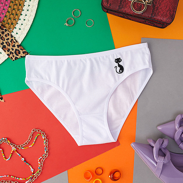Weiße Damen-Slips aus Baumwolle mit aufgesticktem Kätzchen - Unterwäsche