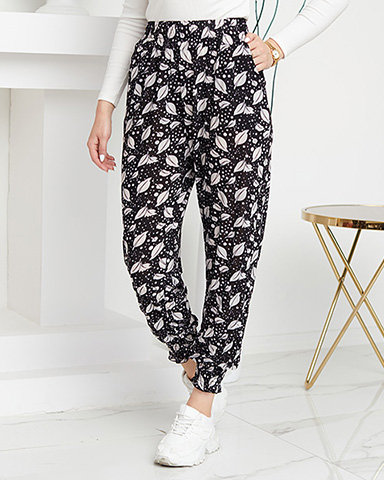 • Tolle gemusterte Damenhose mit mittlerer Taille - aus leichtem und luftigem Stoff. Sie haben einen elastischen Bund und Bündchen an den Beinen. Dieses Paar verleiht jedem Outfit Stil! HINWEIS: Messgenauigkeit (+/-) 1 cm.