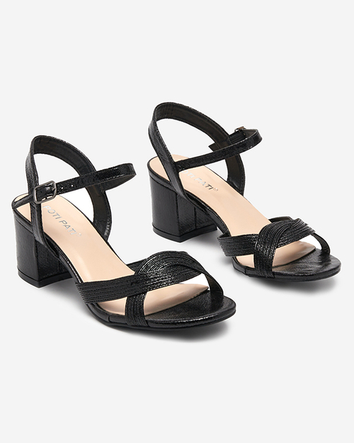 Schwarze Damensandale auf dem Pfosten. Offal- Schuhe