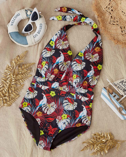 • Einteiliger Damen-Badeanzug mit exotischem Pflanzenmuster, gepolsterten Körbchen und Bindeband um den Hals. HINWEIS: Messgenauigkeit (+/-) 1 cm.