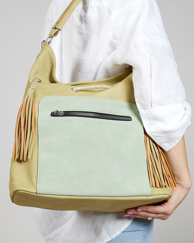 - Modischer Damen-Shopper mit Reißverschluss aus Kunstleder mit dekorativen Schnüren. Das Modell hat: - 1 Fach, - 2 Steckfächer und 4 Reißverschlussfächer, - einen Tragegriff und einen abnehmbaren, verstellbaren Gürtel.