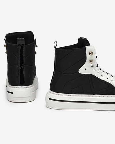 - Sportlicher Damenschnürschuh mit hohem Schnürschaft. Das Modell besteht aus einer Kombination aus Stoffmaterial und lackiertem Kunstleder. Dickere Gummisohle, Stoffeinsatz.