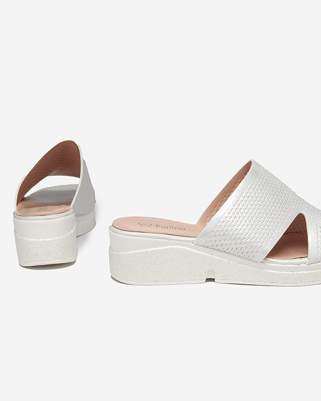 - Modische Damenhausschuhe auf niedrigem Keilabsatz aus weichem Öko-Leder. Modell mit Glitzer veredelt. Ziehen Sie sie für den Sommer mit einem kurzen Kleid an!