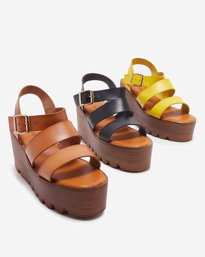 - Modische Damensandalen mit Keilabsatz und Plateau aus Kunststoff à la Holz, Riemen aus Kunstleder. Die Innensohle ist ebenfalls aus ökologischem Leder. Das Modell wird außen mit einer Schnalle befestigt. Ziehen Sie sie für den Sommer mit einem langen Klei