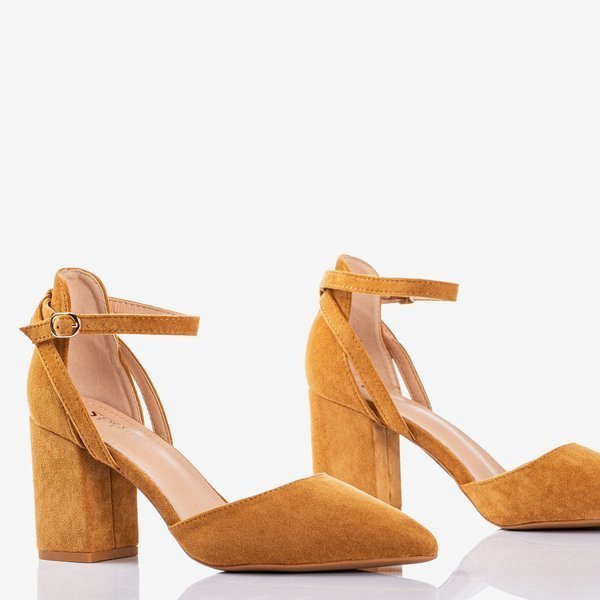 • Damenpumps auf hohem Pfosten aus ökologischem braunem Sämischleder. Die Innensohle ist mit ökologischem Leder überzogen. Nase mit spitzer Spitze. Hinweis: Das Produkt hat Schmutz auf dem Material.