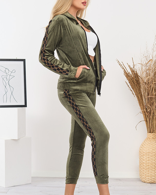 - Modisches Damen-Sweatshirt-Set aus La-Velours-Material. Sweatshirt mit Reißverschluss, Kapuze und zwei Taschen. Hose mit elastischem Bund und Eingrifftaschen vorne. Das Gewerk ist mit Streifen dekoriert. HINWEIS: Messgenauigkeit (+/-) 1 cm.