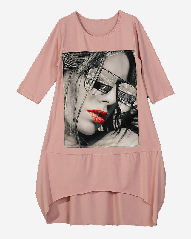 Pinkfarbenes Damenkleid mit Aufdruck und Ausschnitt unten - Kleidung