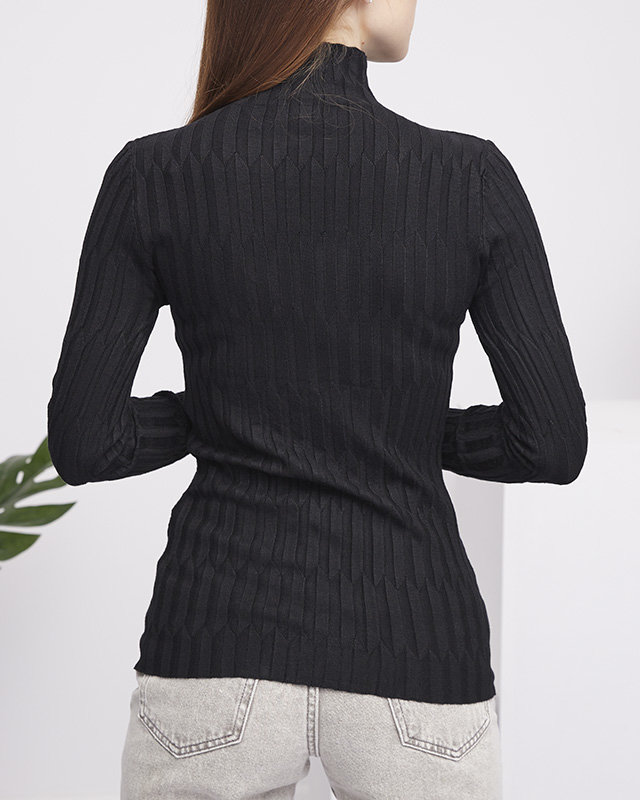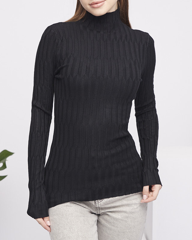 Schwarzer gerippter Damenpullover mit Stehkragen - Bekleidung