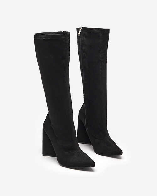 - Geschmackvolle Stiefel auf einem Pfosten mit spitzer Kappe. Das Obermaterial besteht aus Öko-Wildleder in Schwarz. Die Innensohle ist mit Kunstleder überzogen. Innen befestigte Damenschuhe.