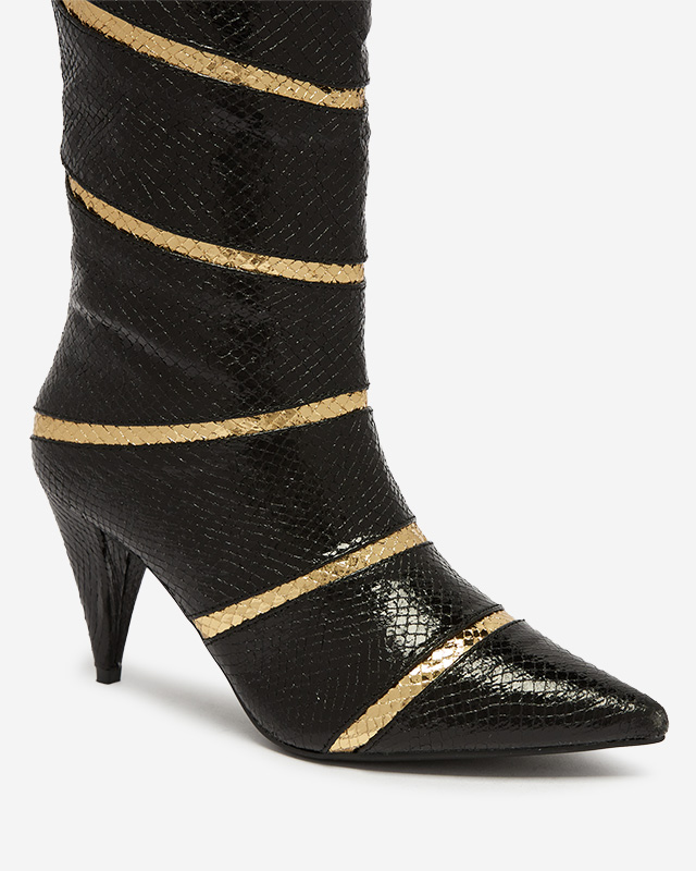 Schwarz-goldene Damenstiefel mit Stilettoabsatz und geprägten Streifen Felifea- Footwear